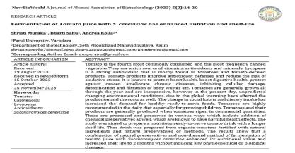 Cite: Shristi Muraka, Bharti Sahu, Andrea Kolla (2023) Fermentation of Tomato Juice with S. cerevisiae has enhanced nutrition and shelf-life. NewBioWorld A Journal of Alumni Association of Biotechnology,5(2):14-20. 10.52228/NBW-JAAB.2023-5-2-3